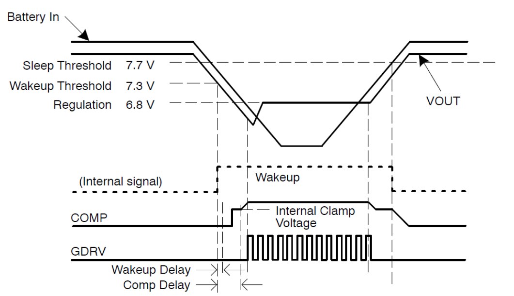 With a dedicated pin for both monitoring input voltage and supplying the IC, the monitoring function utilises an integrated resistor divider, which is disconnected in sleep mode to achieve a very low Iq.  This compares the input voltage to three internally programmed thresholds, which in the event of a falling input voltage crossing these thresholds firstly to wake the IC (Wakeup Threshold) and then secondly regulate the output voltage (Regulation).  The third threshold triggers the IC into its low Iq sleep mode (Sleep Threshold) as the input voltage rises.  Conventional boost controller ICs have a soft-start (where Vout typically rises exponentially at start-up), prohibiting a rapid response during battery voltage cold crank voltage sag.  The NCV8876 and NCV8877 don’t have a soft-start delay allowing a rapid response to achieve output regulation, the compensation amplifier pre-charging the compensation capacitor at wakeup (STATUS low).