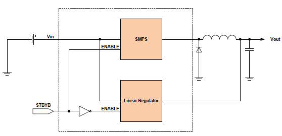 Where the load current is high or power dissipation needs to be minimised then a switched mode power supply (SMPS) needs to be considered.  As discussed in my previous blog, one way of achieving this is by use of techniques such as pulse frequency modulation (PFM) or burst-mode, but another means might be the use of an integrated hybrid topology where a linear regulator and an SMPS are used in parallel.