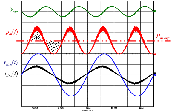 Figure 1 shows the line current (black trace) and the line voltage (blue trace) as a function of time. As a result of the PFC function, both of them are sinusoidal. Thus, the power provided to the load has the shape of a square sinusoid as shown by the red trace. Now, as suggested by the red dashed line, the output power is generally constant and the provided power matches the load demand in average. There are periods of time for which the PFC stage provides more power than needed (see “+” sign area) and the output capacitor absorbs this excess of energy. On the other hand, a second phase follows when the PFC stage supplies less power than necessary (see “-” sign area) and the output capacitor discharges to compensate the lack of energy. The output voltage consequently (green trace) exhibits a ripple at twice the line frequency (typically 100 Hz in Europe, 120 Hz in US). This low-frequency ripple is inherent to the PFC function.