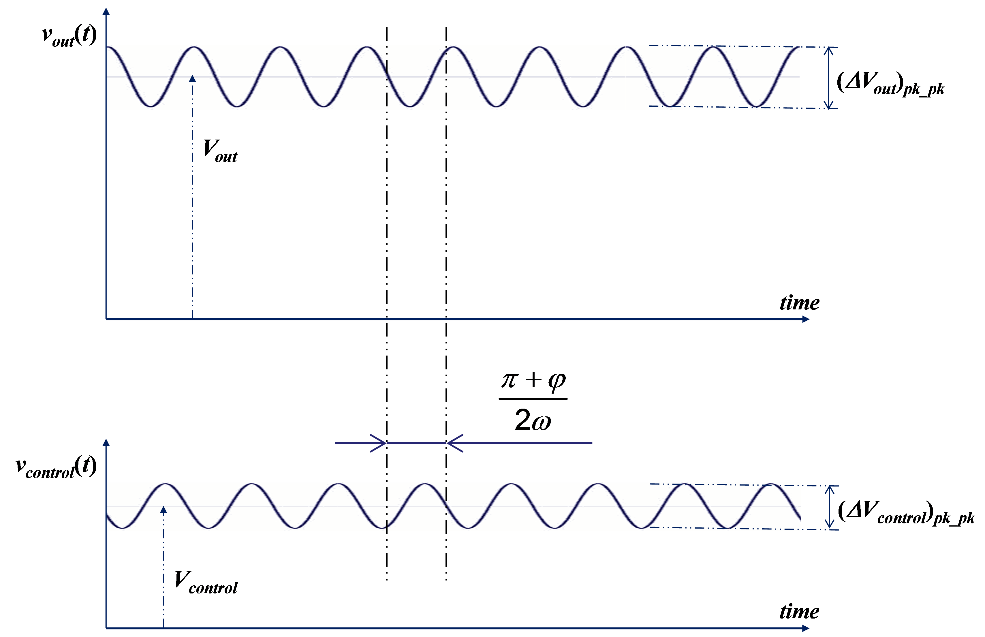 They show that the vcontrol(t)ripple provides a second fundamental component (blue term of equation (2)) that can be put in phase if the vcontrol(t)ripple is 3π/2 phase-shifted with respect to the output voltage ripple