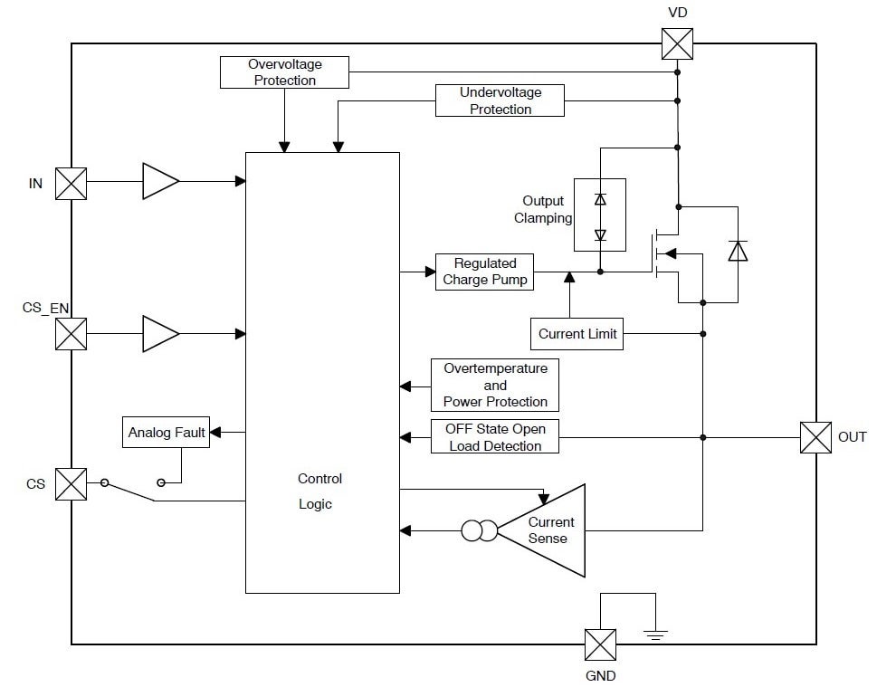 入力(IN)ピンは、ロジックレベル・ピンであり、制御ロジック/チャージポンプをオン/オフしてFETを動作させます。電流センスイネーブル (CS_EN) ピンは、電流センス機能を有効化および無効化します。電流センス (CS) ピンは、比例負荷電流センシングをマイクロコントローラにフィードバックし、リアルタイムでフィードバックすることができます。このピンは、マルチプレックスされており、通常動作と容易に区別できるアナログの故障イベントを報告し、出力電流または故障状態をリアルタイムで感知する機能を提供します。電圧 (VD) ピンはバッテリまたは電源に直接接続し、OUT ピンは負荷に接続します。最後に、グランド(GND)ピンは、単にデバイスのGNDです。