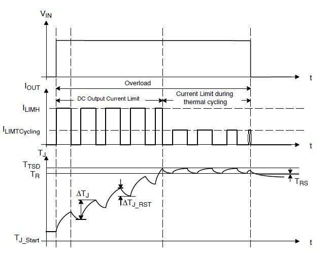 • 電流制限(下の図3を参照)は、短絡や突入事象が発生した場合に電流を制限し、損傷を防止します。電流は、デバイスの内部ダイ温度が過熱点を超えるまで制限されたままとなり、十分に冷却されるまで保護のために自らオフになります。この機能は、高い初期突入電流を必要とする電球負荷の駆動に優れており、また、高電力や温度変動によるダイへのストレスも制限されます。