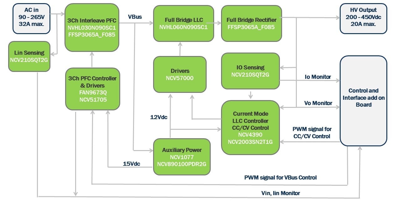 オン・セミコンダクターは、2018年1月に初めて 3.3kW OBCディスクリート・リファレンス・ソリューションを発表しました。これは、トップクラスの力率コントローラ (PFC) (FAN9672Q) とLLCコントローラ(FAN7688)を備え、90%超の動作効率を実現しました。