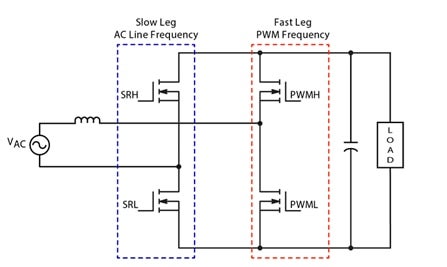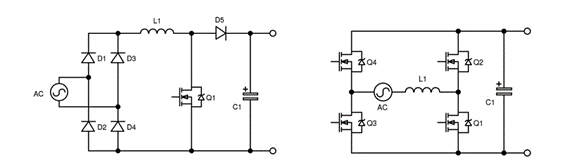 Replacing the boost diode with a synchronous rectifier helps and the two line rectifier diodes can be similarly replaced which further enhances efficiency. This topology is referred to as totem pole PFC (TPPFC) and, in theory, with an ideal inductor and perfect switches, efficiency will approach 100%. While silicon MOSFETs offer good performance, wide bandgap (WBG) devices offer far closer to ‘ideal’ performance.