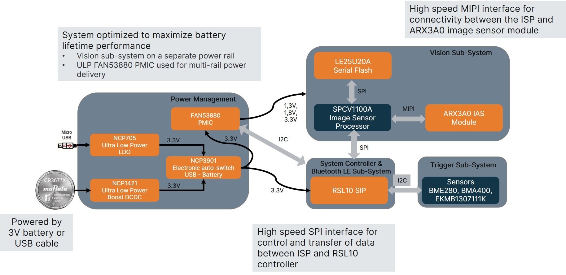 RSL10 SIPの優れた低消費電力動作に加えて、カメラプラットフォーム上の他のすべてのシステムコンポーネントは、このプラットフォームのバッテリー寿命を最大限に延ばすように選択されています。最新の電源管理システムでは、充電式電池の代わりにコイン電池を使用しており、これが超低消費電力とBoMの超低コストに大きく貢献しています。このビジョンサブシステムは、イメージセンサとイメージシグナルプロセッサを含んでおり、それらは独立した電源レール上に配置されています。これにより、コントローラ(RSL10)は、カメラの動作時間の大部分でビジョンサブシステムの電源を完全にオフにし、イベントがトリガされたときに画像を撮影するためだけにオンにすることができます。また、RSL10 SIPは、ほとんどの時間でディープスリープ状態を維持し、カメラがアドバタイジング・モードの時とトリガされた時の接続モードの時のみアクティブになります。