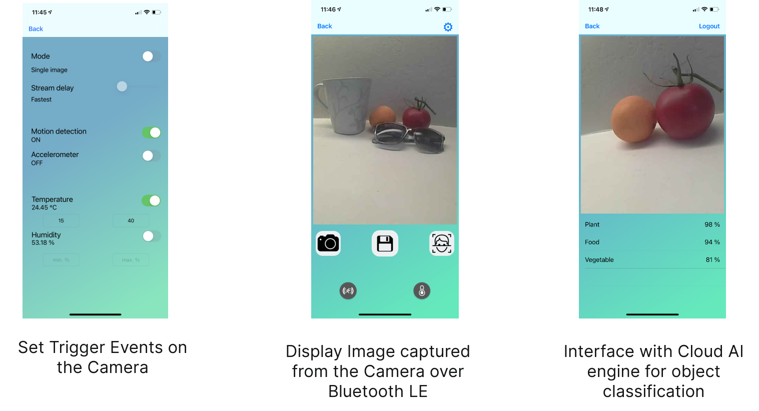 RSL10 Smart Shot Color Cameraは、Android™ およびiOS® プラットフォームで利用可能なモバイルアプリでサポートされています。開発者は、このモバイルアプリを使用して、トリガ条件の設定、画像の撮影、Amazon Rekognition™(AWS)クラウドプラットフォームを使用した画像分析を行うことができます。