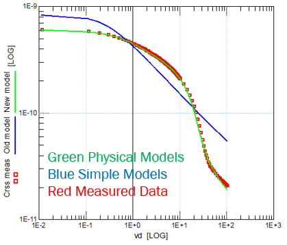 簡素なサブ回路は、すべてのデバイス性能を適切に捕捉するには機能不足です。図1に、一般の単純モデル(青)と、当社のより進んだ物理モデル(緑)とを比較したCRSSの描画と測定データ(赤)を示します。単純モデルは非線形の容量効果を捕捉していないことが明確にわかります。そのため、不正確な動的スイッチングシミュレーションになってしまいます。
