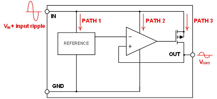 3つめのパスは、パスデバイスを通る出力までのカップリングです。リップルはレギュレータの適切な補正により削減されます。これは出力電圧リップルの最大の要因であり、適切に設計されたLDOであれば、これを低周波数および中周波数領域で抑制できるはずです。
