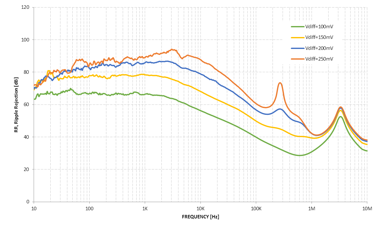 図5は、見落とされることが多い電圧ヘッドルーム・パラメータとそれがPSRRに与える影響を示しています。電圧ヘッドルームは、VINとVOUT の電圧差であり、LDOドロップアウト電圧と混同してはなりません。下記の例では、NCP163は、非常に低いドロップアウト電圧を提供しています。したがって、ごくわずかな電圧ヘッドルームを使用して非常に優れたPSRR性能を達成できます。信頼性の高い動作を実現するためには100 mVの電圧ヘッドルームで十分ですが、1ミリボルト増加するごとにPSRRが大幅に改善することが分かります。最終的に、収穫逓減が生じて、300 mVを超える差を使用する必要がありません。