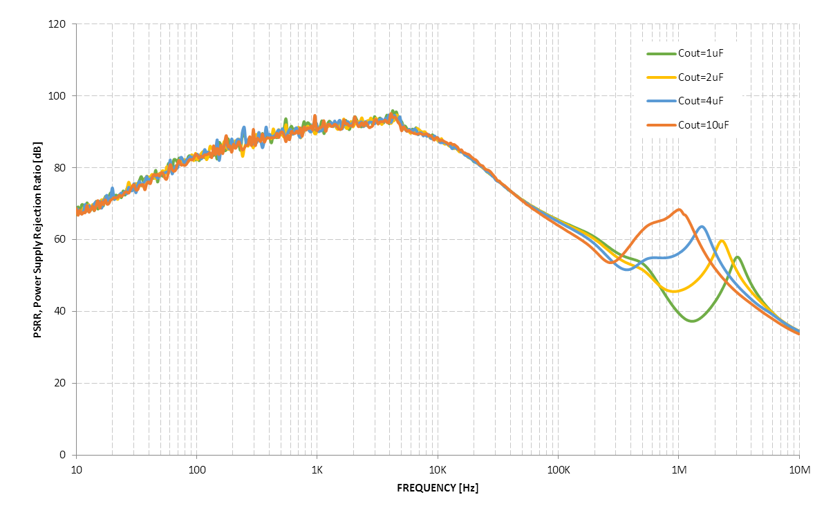 LDOのPSRR性能は、外部アプリケーションの条件の影響も受けます。最も重要な要因は、負荷電流、出力コンデンサ、および電圧ヘッドルームです。1つずつ詳しく見ていきましょう。