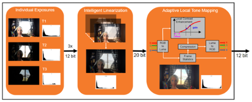 • 使得 12 位线性 ISP(非 HDR 增强)能够处理 120dB 图像和视频。