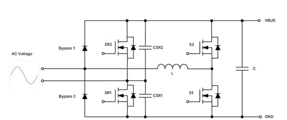 In the totem pole PFC topology, the two diodes (SR1 and SR2) can be replaced by MOSFETs to achieve higher efficiency. This is because they conduct during the operation of the totem pole but switch only at 50/60 Hz. The bypass diodes only conduct at start−up, so there is no benefit from replacing them with MOSFETs.