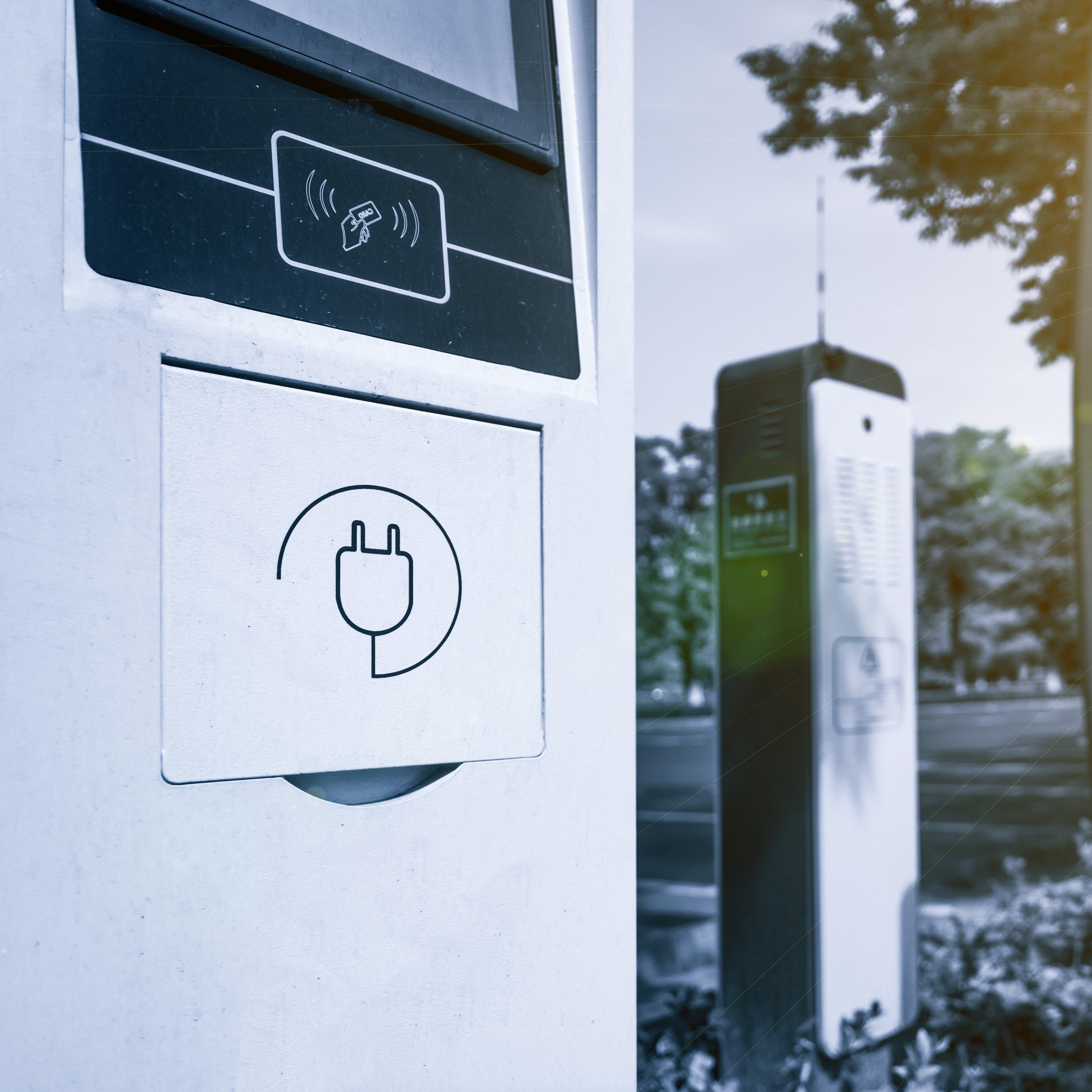 eモビリティエコシステムでは、低速の交流(AC)充電器とは対照的に、直流(DC)充電器が「高速」および「超高速」充電機能を提供します。基本的に、EV 充電器は電力系統からのAC電力をEVのバッテリに最適なDC電力に変換します。DC充電での電力変換は、EVの外部(「オフボード」)で処理され、50 kW未満から 350 kW (さらに高レベルも開発中)を超える範囲の電力レベルで車両に供給されます。高出力のDC充電器は通常、モジュール式となっており、15~75 kW(およびそれ以上)の電源ブロックが1つのキャビネットに積み重ねられます(Figure 1)。一般に、DC 充電器の出力電圧は150 Vから1000V以上の範囲にあり、400 Vおよび800 Vの標準的なEVバッテリレベルをカバーしており、より高い電圧またはより低い電圧範囲に合わせて最適化することができます。