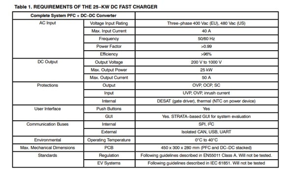通信ポートに関しては、ボードは外部インタフェース(電源ブロック、充電器システムコントローラ、車両、サービス、およびメンテナンスの間)用に絶縁された CAN、USB、および UARTインフラストラクチャを提供します。全体として、EV充電のためのIEC-61851-1およびIEC-61851-23規格のガイドラインに沿った設計とします。下表はシステム要件をまとめたものです。