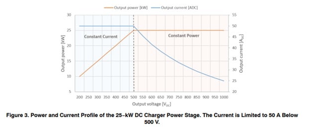 オンセミチームは、双方向機能を持つ25 kWのDC充電器を開発しています。このシステムは広い出力電圧範囲をカバーし、400Vと800Vの両方のバッテリでEVを充電でき、より高い電圧レベルに最適化されています。入力電圧は、EU 400 VacおよびUS 480 Vac三相グリッド用に定格が規定されています。電力ステージは、500 V~1000 Vの電圧範囲で25 kWを供給します。500 V未満では、出力電流は50 Aに制限され、CCSやCHAdeMOなどのDC充電規格のプロファイルに合わせて電力が低下します(Figure 3)。
