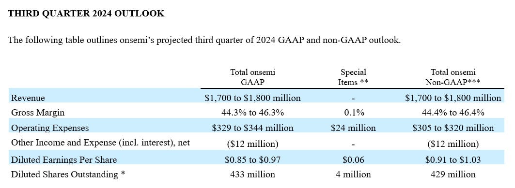 以下の表は、オンセミの2024年第3四半期のGAAPおよび非GAAPベースの見通し概要です。