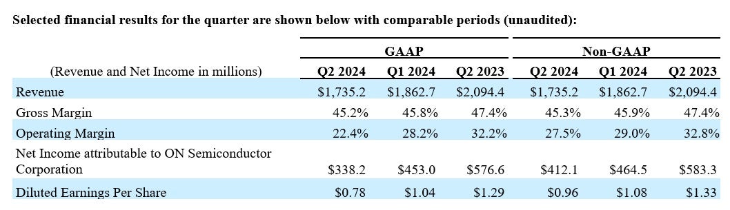 2024年7月30日(米国2024年7月29日発表) - オンセミ(onsemi、本社 米国アリゾナ州スコッツデール、Nasdaq: ON)は、2024年度第2四半期の決算結果を発表しました。主なハイライトは以下のとおりです。